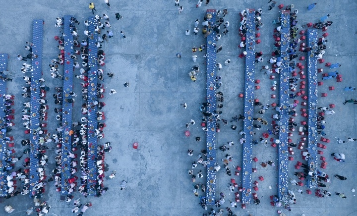 7月4日,游客在松桃苗族自治县盘信镇大湾苗寨吃长桌宴。谢慧芳摄